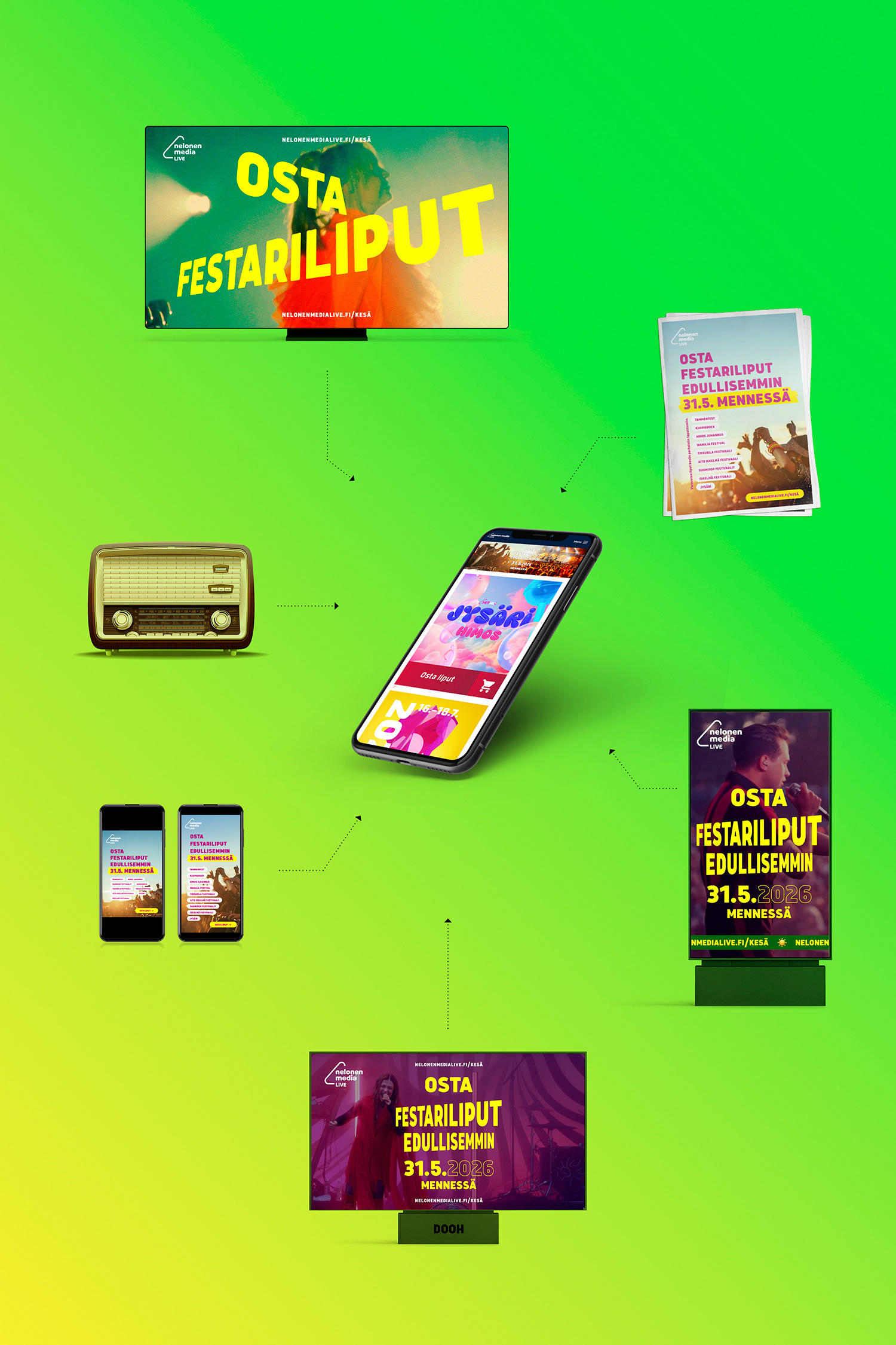 Nelonen Media Livelle suunniteltu ja toteutettu kesän koontikampanjan. Kampanja on kaksiosainen: brändillinen ja taktinen.