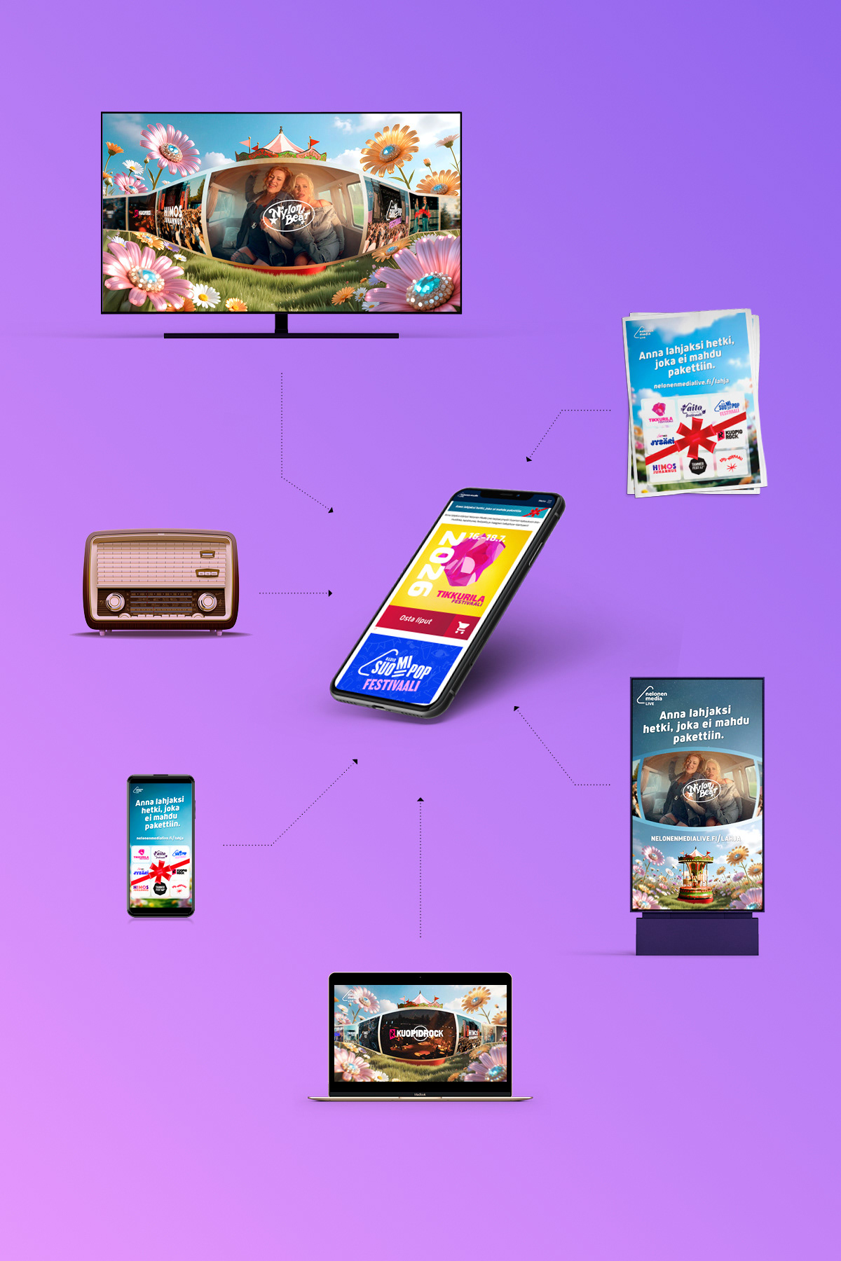 Näkyvyys Sanoman mainosverkosto, mm. Nelonen Median TV-kanavat (Nelonen, Liv, Jim, Hero), printti (mm. Helsingin Sanomat, Ilta-Sanomat, Aamulehti), display, Supla.fi, Nelonen media radiokanavat, Meta, YouTube, Dooh.